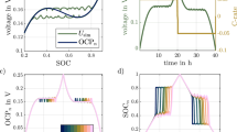 The presence of a two-phase transition in the positive electrode results in a flat OCV curve, which makes the task of estimating the state of charge (SOC) challenging as it causes a lack of observability of the system’s states from the voltage output measurements21. Moreover, a pronounced hysteresis22, and path dependence behavior, i.e., for the same SOC the battery relaxes to different OCV values depending on whether it was charging or discharging, pose additional challenges in the design of battery management system (BMS) strategies.