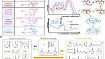 Utilizing the Au(111)-single water-Au(111) junction model with the electrode-electrode distance of d = 20 Å (see Methods for details), we first demonstrate how the electronic and energetic properties of an interfacial water are calculated within MS-DFT under the applied working electrode potential defined as \(\varPhi =-{V}_{b}/2=-\left({\mu }_{L}-{\mu }_{R}\right)/2e\). For the given electrode−electrode distance d, the channel electric field ε0 is determined according to the electrode L potential \(\varPhi\) and will be specified together with \(\varPhi\). In Fig. 1b top panel, for the interfacial water in the ‘H-down’ configuration located at the O atom distance from the Au surface \(\overline{{OM}}\) of 3.5 Å, we show the contour plot of \(\Delta {v}_{H}\left({\boldsymbol{r}}\right)\equiv {v}_{H,L+C+R}^{{V}_{b}}\left({\boldsymbol{r}}\right)-{v}_{H,L+C+R}^{0}\left({\boldsymbol{r}}\right)\) calculated under the negative potential Φ = −2.0 V. We note that this potential drop corresponds to the electric field ε0 = −0.25 VÅ−1, which is stronger than −0.20 VÅ−1 that is expected from the device geometry of d = 20 Å. This inconsistency results from d being effectively reduced due to the finite atomic radius of surface Au atoms (1.74 Å27). We also show in the bottom panel of Fig. 1b the corresponding plane-averaged bias-induced electron density change or Landauer resistivity dipole \(\Delta \bar{\rho }\left({\boldsymbol{r}}\right)\equiv {\bar{\rho }}^{{V}_{b}}\left({\boldsymbol{r}}\right)-{\bar{\rho }}^{0}\left({\boldsymbol{r}}\right)\). The \(\varPhi\)-induced electron transfer from the negatively charged working electrode to the H atoms of the water molecule (dotted box in the Fig. 1b bottom panel) stabilizes the H-down configuration of water, and the bias-induced electrostatic potential drop and interfacial charge transfer behaviors calculated within MS-DFT are presented in Fig. 1b top and bottom panels, respectively. The resulting energetic stabilization is quantified in terms of the electric enthalpy \({{\mathcal{F}}}_{C}^{{V}_{b}}\) profile. In Fig. 1c, we show \({{\mathcal{F}}}_{C}^{{V}_{b}}\) and \({E}_{L+C+R}^{{V}_{b}}-{E}_{L+R}^{{V}_{b}}\) as a function of \(\overline{{OM}}\). Note that the difference the two represents the \({{\boldsymbol{-}}{\boldsymbol{\varepsilon }}}_{0}^{{V}_{b}}\,\cdot\,{{\boldsymbol{p}}}_{C}^{{V}_{b}}\) term and the corresponding downshift of \({{\mathcal{F}}}_{C}^{{V}_{b}}\) curve from the \({E}_{L+C+R}^{{V}_{b}}-{E}_{L+R}^{{V}_{b}}\) counterpart indicates the stabilization of the H-down water configuration due to the same directions of \({{\boldsymbol{p}}}_{C}^{{V}_{b}}\) (negative sign in the H-down configuration) and \({{\boldsymbol{\varepsilon }}}_{0}^{{V}_{b}}\) (negative sign at the negative Φ). Within the MS-DFT formalism, since the non-equilibrium Hamiltonian or total energy is a well-defined quantity, the forces on the nuclei I are straightforwardly calculated according to the Hellmann-Feynman theorem28,29