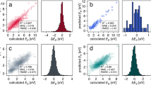 Figure 3 shows the performance of the ensembles. Here, the errors \(\Delta {E}\) range from −30 to 30 kcal/mol, with most errors near the centre (i.e., ΔE = 0). The region with the lowest energy (E < −650 kcal/mol) has higher accuracy with no noticeable high-error structures. The next region, between −650 and −500 kcal/mol, have the largest number of high-error structures broadly spread between positive and negative errors. For higher energies (above −500 kcal/mol), a small spread of the errors with few significant outliers is found. It can be noticed that the region with more outliers is close in energy to the transition state; therefore, the structures are expected to have larger deformation than the other regions. This is related to the fact that the training data set was created to reproduce adequately the hydrogen transfer.