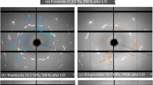 In axial geometry (i.e., when the incident X-ray beam is directed along z-axis) (Fig. 1), diffraction condition is satisfied primarily for crystallographic planes that are nearly parallel (with plane normal perpendicular) to the load axis. Therefore, the observed shifts in diffraction peaks can be practically utilized to estimate strains in the radial and azimuthal directions viz. \({\bar{E}}_{11}^{e}={\bar{E}}_{{rr}}^{e}\) and \({\bar{E}}_{22}^{e}={\bar{E}}_{\theta \theta }^{e}\) averaged over the sample thickness. Ideally, the angle between the load axis and diffraction vector \((\psi )\) should be \({90}^{\circ }\) to accurately estimate these strain components. However, since achieving a \({90}^{\circ }\) angle between the load axis and the diffraction vector is not possible in axial geometry, we can instead use the diffraction peak with the smallest diffraction angle, \(\theta\). In our experiments with \(\alpha\)-Zr, the (100) diffraction peak appears at \(\theta ={3.18}^{\circ }\) for the X-rays used (\(\lambda\) = 3.1088 \({\text{\AA}}\)) at ambient pressure. This corresponds to \(\psi ={86.82}^{\circ }\) and can be used to estimate the strain components \({\bar{E}}_{{rr}}^{e}\) and \({\bar{E}}_{\theta \theta }^{e}\). Note that the (100) peak corresponds to the \(a\) lattice parameter because the \(c\)-axis of \(\alpha\)-Zr is predominantly aligned along the loading direction, as determined by our texture analysis.
