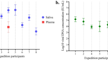 Four saliva samples were collected at each of 7 sampling sessions, approximately corresponding to the following time points: Sessions 1–2: 180 and 45 days before flight; Sessions 3–5: during flight at mission day 14 days (early), between mission days 60–120 days (mid-mission) and about 180 days (late); Sessions 6–7: 3 h after landing and 30 days after landing (Fig. 1). A 10 mL EDTA anti coagulated peripheral blood sample and a 24-h urine pool were also collected before and after each mission time point. Only one blood sample was taken at each inflight time point, as shown in Table 3.