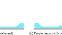 Bubble evolution is mainly governed by normal stresses at the bubble interface since the contribution of tangential stresses estimated above is relatively small. The normal stresses include the surface tension pressure, liquid hydrostatic pressure, and dynamic pressures of liquid and condensing vapor. The role of the dynamic pressure of liquid flow driven by the bubble growing at the timescale of the order of minutes (Fig. 3a–d) is insignificant as the ratio between its value and the surface tension pressure 4γ1/D is ~ 2×10−6. The contribution of the vapor dynamic pressure can be neglected65,66,67,68 only if the ratio \({\mathrm{\rho }}_{\mathrm{v}}{\dot{\mathrm V}}_{\mathrm{v}}^2/{\mathrm{\pi }}^2{\mathrm{D}}^3{\mathrm{\gamma }}_{\mathrm{l}}\) is smaller than 2.5×10−6, where Vv = qSh/ρvhfg is the vapor flow rate inside the bubble. An extremely low flow rate is required because the vapor velocity increases rapidly when the bubble neck shrinks radially. In our experiments at Th>100 °C where qh was varying from 0.3 to 1.2 MW/m2 (Fig. 4a), this ratio ranging from 1.3×10−4 to 2.1×10−3 exceeded significantly this limitation. Nevertheless, the quasi-static equation for a pinned bubble65,66,67,68 that considers only the surface tension and hydrostatic pressures provides some understanding of the bubble behavior. In particular, the dimensionless solution of this equation predicts that the bubble shape is fully characterized by its relative height 2h/D and the Bond number Bo = (D/2Lc)2. In boiling, the bubble height is determined by the thermal balance across the bubble cap that is expressed in terms of Nu specified by Ts (Fig. 6b). This feature explains why dimensionless characteristics of bubbles in ground experiments plotted against Ts for various values of q but all with Bo~ 0.16 for 100 °C would group together (Fig. 4c, d). It also explains a more elongated shape of bubbles observed in ground experiments compared to a spherical shape of bubbles formed in flight at Bo~ 1.6×10−3 (Fig. 4e). Within the framework of the quasi-static equation, the greatest value of the relative bubble height 2hmax/D at a particular value of Bo for which the neck becomes zero is assumed to represent a bubble that divides into two parts in the neck region, one forming a departing bubble and the other a new pinned bubble.66,67,68 Expressions67,68 for the bubble at zero neck predict height hmax = 5.4 mm with the width 3.1 mm and volume Vd = 26.4 mm for Bo~ 0.16 and D~ 2 mm occurred in our ground experiments. While we observed a similar mode of bubble departure, a bubble at this instant was more elongated and its volume was two-three times smaller, depending on the heating regime (Fig. 3c). These estimates and experimental data on the bubble departure time (Fig. 4f, Eq. 2) indicate that the bubble pinch-off was strongly influenced by the vapor flow rate at the bubble base that is determined by the heat flux.