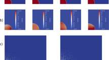 OpenFOAM computational fluid dynamics software (http://www.openfoam.com/) is employed to simulate the pairwise coalescence of identical sessile drops for the specific experiments described above. We briefly describe the procedure. Pre-processing is specified via blockMesh, a native OpenFOAM stencil tool, here used to generate a 2.6 mm × 2.6 mm × 2.6 mm cubic computational domain comprised of uniform cubic cells with edge length ϵ = 20 μm, shown in Fig. 2. Increasing cell count by 25% yields <1% change in horizontal and vertical coalescence extensions; then the simulations are considered spacially converged with the chosen ϵ. Initial conditions are specified via the setFields utility, which specifies the initial cell value to a liquid or gas phase. Drop diameters D, static contact angles θ0 (c.f. Fig. 2), and parameters θa, θr, and M, are taken from experimentally measured values. Fluid properties are given in Table 3. Open-flow boundary conditions, i.e. fixed pressure and zero velocity gradient, are specified on all boundaries except the substrate. The gravity vector g is oriented in the negative z-axis direction with magnitude 9.81 m/s2, consistent with experimental conditions. Material advection, momentum, and continuity equations are solved for either the (1) Davis–Hocking or (2) Kistler dynamic contact angle model. The contact-angle model effectively prescribes the gradient of α according to the contact angle49. The numerical solution is computed via interFoam, a volume of fluid (VOF) solver, applicable to incompressible, laminar, and two-phase fluid flow. Here we note that the interFoam solver has been modified to remove artificial anti-diffusive surface fluxes, which have been previously shown to improve transient behaviors in capillary-dominated flows50. All post-processing is conducted in ParaView, a native software included with the OpenFOAM installation. The relevant non-dimensional numbers for the simulations are presented in Table 4 and are consistent with inertial-capillary spreading, Re ≫ 1, Ca ≪ 1, and Oh ≪ 1, for all cases.