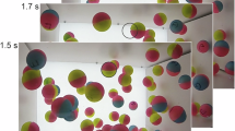 During the particle tracking, some collision events between the particles are used for measurement of energy dissipation rate (cf. Fig. 3b). We manually select those events with the motions of both particles before and after the collisions approximately within a plane vertical to the camera view. In other words, we consider in our selected collision events that the changes of the depths of two particles are small compared to their changes of speed in this plane, and the measured translational kinetic energies from the two-dimensional image analysis are close to their three-dimensional values. We measure the translational speeds (v1, v2) and \((v^{\prime}_{1} ,v^{\prime}_{2} )\) of the two colliding particles before and after the collision and calculate the translational kinetic energy T and \(T^{\prime}\) before and after collisions. The ratio
