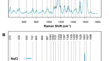 Raman spectra were collected from the surface of plant leaves with a hand-held Resolve Agilent spectrometer equipped with an 830-nm laser source. Spectral resolution was 15 cm−1. The following experimental parameters were used for all collected spectra: 1 s integration time, 495 mW power, and baseline spectral subtraction by device software. Absence of photodegradation under these experimental conditions was previously demonstrated by our group12. Thirty spectra were collected from leaves of each group of plants. The laser post on the surface was ~2 mm in diameter. Spectra shown in the manuscript are processed through MATLAB, normalizing on 1440 cm−1 peak, which corresponds to CH2 vibration, which is present in nearly all classes of biological molecules, and applied with Savitzky-Golay smoothing using a polynomial order of 0.