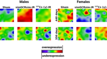 To assess the effects of γ- and simGCRsim-IR, we performed differential gene expression analysis across comparison groups. Raw gene count data were filtered to exclude genes with counts lower than 20 in any sample. Differential gene expression analysis was conducted using the DESeq2 R package (version 1.42.0)40. Due to the presence of multiple samples with low RNA integrity numbers (RIN) within the experimental groups, samples from different time points were combined in order to increase the number of high-RIN samples included in each group. This approach was taken to mitigate the impact of RNA degradation on downstream analyses and to ensure more reliable differential expression results by minimizing the risk of false-positive findings. Following normalization, scaling, and global variance estimation, we evaluated differential gene expression in 4 groups, comparing both γ- and simGCRsim-IR with their respective control groups in males and females. Genes with an FDR-adjusted p-value (padj) < 0.05 were considered as differentially expressed. Additionally, we conducted an overrepresentation analysis (ORA) using the enrichR R package (version 3.2) to identify pathways and biological processes significantly enriched with differentially expressed genes41. The overall study workflow is illustrated in Fig. 5B.