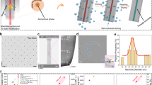 Figure 1b, c showcase some characteristic examples of the a-Lith process’s unique attributes; specifically shown here are nanogap structures of arbitrary length and geometry using different electrode metal combinations (Al/Au and indium tin oxide (ITO)/Al) deposited on different substrate materials, namely glass (Fig. 1b) and polyethylene terephthalate (PET) (Fig. 1c). For reference, Al/Au asymmetric electrode gaps fabricated on PET have been used to demonstrate flexible RF Schottky diodes based on various solution processable semiconductors.5 Conversely, Al/Al symmetric electrode air-gaps patterned on plastic substrates have been used to realise semiconductor-free non-volatile memory devices,6 while ITO/Al asymmetric structures similar to those shown in Fig. 1c are anticipated to be attractive for certain optoelectronic applications in which semi-transparency is a desired characteristic.