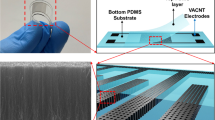 A custom-built uniaxial stretching machine was adopted as the assembly platform to apply the uniaxial strain to the PDMS substrate. To measure the differential capacitive signal of the 3D capacitive sensor, a customized electronic circuits was designed with all commercial components, including a universal capacitive readout chip (MS3110, Irvine Sensor) and a 24 bit ADC chip (AD7175-2, Analog Devices). The digital signal of the circuit is able to reach 24 bit resolution and 50 kHz sampling rate. The digital signal of 3D capacitive sensor was recorded using the software LabVIEW. The difference between the digital signal of sensors with external loads and that without external loads was then converted into the capacitance change following the linear relationship in Fig. 3b. A mechanical test system (CB500; NANOVEA) was used to perform the compressive experiments. The experiments utilized a load-controlled mode at a loading rate of 1 V min−1 with a speed of 6 μm min−1. In order to calibrate the force responses of 3D capacitive sensors, the commercial force sensor (FT-S100; FemtoTools) and the AFM (MFP-3D; Oxford Instruments) were employed to implement different levels of forces. A nano-driving stage (S02893; Mad City Labs) was used to apply compressive displacement. A commercial accelerometer (352C33; PCB Piezotronics) was used to calibrate the performance of 3D capacitive accelerometer.