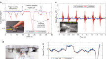 Equations (3) and (4) indicate that the capacitance change of the 3D capacitive sensor with a lower equivalent stiffness is greater than that with a higher equivalent stiffness for the same external force. In other words, the 3D capacitive sensor with a lower equivalent stiffness is more sensitive. Therefore, we adopt an optimized set of design parameters (t = 50 μm, Ws = 400 μm, Lm = 4 mm, and Wm = 5 mm) for the 3D capacitive sensor, yielding a relatively low equivalent stiffness (~4.75 N m−1). Firstly, the 3D capacitive sensor is measured by the atomic force microscope (AFM, MFP-3D Infinity; Oxford Instruments). By changing the applied voltage of AFM, different levels of compressive force were applied on the 3D capacitive sensor, as shown in Fig. 3c. The differential force of adjacent steps is about 33.77 nN, corresponding to 0.05 V for each increment of the applied voltage. Other differential forces (337.7, 67.54, and 50.65 nN), as shown in Supplementary Fig. 8a–c, correspond to the difference of the applied voltages of 0.5, 0.1, and 0.075 V, respectively. The above calibration demonstrates that the developed sensor possesses a high force resolution, and ensures that the force can be distinguished at the level of nano-Newtons. To obtain the displacement sensitivity, the 3D capacitive sensor is loaded and unloaded under different levels of applied strains. Figure 3d shows the measurements and theoretical results (Eq. (4)) of the displacement sensitivity versus the initial gap. The schematic illustration of the experimental system is shown in Fig. 3d (right), in which a tungsten probe is used to apply a compressive force. The variation of the output signal for two states (d0 ≈ 234 μm and d0 ≈ 40.6 μm) with a compressive displacement (U = 10 μm) is demonstrated in Supplementary Fig. 9. When the initial gap between mover and stators is reduced from ~234 to ~40.6 μm, the corresponding displacement sensitivity is changed from 1.64 × 10−3 to 5.46 × 10−2 pF μm−1, corresponding to a 33-fold change. The experimental results are in good agreement with theoretical predictions. Theoretically, the displacement sensitivity can be improved further by reducing the gap according to Eq. (4). As shown in Supplementary Fig. 10, the force sensitivity and resolution of the developed sensor were calibrated via the commercial force sensor (FT-S100; FemtoTools). Supplementary Fig. 10c presents the calibrated results of the output signal versus compressive force, corresponding to the initial gap d0 = 40.6 μm. By applying the compressive force F = 8.82 μN, the output signal changes to 0.101 pF. Consequently, the force sensitivity of the 3D capacitive sensor can be determined as 1.15 × 10−2 pF μN−1, and the ratio of displacement sensitivity-to-force sensitivity is 4.75 N m−1. The output signal noise of the sensor at a sampling frequency of 19 Hz is 20. At this working state (d0 = 40.6 μm), the available force range of the sensor is from 0 to 74.1 μN, and the force resolution can be calculated as ~5.22 nN69. Table 2 shows the performance comparison among the developed 3D capacitive sensor, the MEMS differential capacitance force sensor69, and the commercial force sensor (FT-S100)69. The commercial force sensor adopts a comb-tooth capacitive structure, which has a maximum force resolution of ~5 nN, a working range of 100 μN, and a sampling frequency of 10 Hz with a fixed force sensitivity. Here, the force resolution of the developed sensor is comparable to that of the commercial force sensor (FT-S100). Owing to the tunability, the working range of the developed sensor is much larger than that of FT-S100. Although the developed 3D capacitive sensor has a lower force resolution than that of MEMS differential capacitance force sensor, it achieves a tunability of force sensitivity and working range, thereby expanding the application range of a single capacitive sensor. It is noteworthy that a relatively higher level (e.g., 20% or 30%) of prestretch can be also used in the 3D assembly to offer a higher stretchability of the 3D capacitive sensor, but the force sensitivity would be reduced with the use of higher prestretch (Fig. 3d). To meet the specific requirements of practical applications, the prestretch strain can be determined through a trade-off between the stretchability and sensitivity.