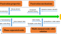 The choice of alloying elements is also an important descriptor. For instance, aluminum (Al) is used to synthesize lower density MPEAs because of light weight. In addition to that, Al helps to improve the mechanical strength of the MPEAs44,45,46,47,48,49,50. However, Al present in the Al based MPEAs is less noble (lower in the galvanic series) compared to the other alloying elements, such as Fe, Ni, Cr, Co, and Ti that are used to synthesize MPEAs51. Therefore, it is reasonable that in the presence of aqueous corrosive environments, Al atoms may be preferentially released from MPEA solid solution compared to other alloying elements and hence introduce dealloying. It is reported that depassivated Al-containing MPEAs have a higher corrosion rate and the rate increases with increasing Al content in the presence of a corrosion environment, which promotes dissolution. Interestingly, Al is beneficial when used as thin film for surface passivation as reported in the case of Ni-based corrosion-resistant alloys52. It is also reported that MPEAs containing Cr, Fe, and Ni showed good corrosion resistance in both NaCl and H2SO4 solution as compared to steel. Hsu et al. reported that due to the presence of Cr and Ni, CoCrFeNi MPEA showed better corrosion resistance as compared to 304LSS53.