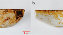 Chemical compositions of the body and the glaze of the 11 samples are listed in Supplementary Table 1 and Table 1, respectively. The chemical compositions of the sample bodies are similar and are consistent with the compositions of the typical Longquan celadon bodies23, indicating that the batch of celadon was likely produced in the same kiln. The composition acquired on the cross section of the glaze avoids corrosion of the surface, so it can generally represent the composition of the uncorroded glaze. For the transparent glaze, the compositions acquired on the glaze surface and cross section were not significantly different. In the matte glaze, the MgO content of the altered glaze surfaces of Nos. 08 (2.33 wt%) and 09 (16.31 wt%) was higher than that of the cross section (0.33 wt% and 1.26 wt%, respectively). The Fe2O3 content of the altered surface of No. 09 (9.78 wt%) was also significantly higher than that of the cross section (1.99 wt%). To show the difference in the glaze composition more intuitively, the analysis diagram of MgO and Fe2O3 contents is plotted, as shown in Supplementary Fig. 2. It is shown that the compositions acquired on the cross section and the altered surface of most samples are similar, while the contents of altered surface of Nos. 08 and 09 are significantly higher. For No. 08, the reason for the difference may be due to surface crystallization, while the greater difference of No. 09 may relate to the corrosion process and yellow substances on the surface, which will be further explained below by combining the glaze microstructure.