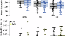 Notably, whole-brain analyses may obscure true effects due to stringent multiple comparison corrections, particularly in small nuclei such as the SN34,35,36. Consequently, our hypothesis-driven ROI analysis revealed significant intergroup differences. Both the QSM and χpara values of the bilateral SNpc were significantly greater in both PD subgroups than in the HC group, which is consistent with the results of the whole-brain analysis. This finding is consistent with a recent meta-analysis of 17 studies (11 QSM, 6 R2*), confirming pathologically increased susceptibility in the bilateral SNpc in PD patients11. This increased susceptibility is attributed primarily to iron accumulation in dopaminergic neurons and microglia37,38. Interestingly, we observed that magnetic susceptibility values in the SNpc were similar between the PD-RBD- and PD-RBD+ groups, but associations with clinical features suggest that increased iron content in the SNpc is correlated with severity of symptoms. Our results suggest that changes in the iron content of the SNpc may not be causative of secondary RBD in PD patients, at least in the early stages of the disease. As the PD progresses and RBD develops, the iron content of the SNpc may gradually increase, affecting the severity of RBD symptoms. However, this speculation requires verification, especially through longitudinal studies.