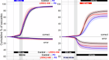 We excluded any PS, AS, or MGS trial in which a participant blinked within 100 ms of the peripheral stimulus onset, blinked during the interval between the peripheral stimulus onset and the primary saccade (in the PS and AS tasks), or blinked between the fixation target offset (the cue) and the primary saccade (in the MGS task). In the SGS task, we excluded the IPSR measurement of the first primary saccade following a blink. Blink onsets and offsets were detected by calculating the eye aspect ratio59 for each frame in the iPad’s video recording, which provides a measure of eye closure. Additionally, PS, AS, or MGS trials were excluded if the participant did not produce a saccade or if signal loss in the EyeLink data rendered the primary saccade unusable. For the SGS task, if signal loss in the EyeLink data rendered a primary saccade unusable, the IPSR measurement of the subsequent primary saccade was excluded.