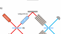 In addition to loss, the spectral purity and distinguishability of our photons are also sources of imperfection that reduce the contrast of the fringes and hence diminish \({\tilde{{\mathcal{F}}}}_{{h}_{1},{h}_{2}}(\phi )\)41. Consider the probe \(\left|1,1\right\rangle\), for example. For ϕ = ±π/2, the whole interferometer acts as a balanced beam splitter, in which case Hong-Ou-Mandel interference should lead to a complete suppression in coincidences at its output. However, as can be seen in the orange (1, 1, 1, 1) fit in Fig. 2a, the visibility of this interference effect is ~75%. This visibility exceeds \(\sqrt{0.5}\), which is the minimum required for demonstrating post-selected quantum-enhanced sensitivity with the probe \(\left|1,1\right\rangle\)12,28,42. In addition to spectral mismatch between the signal modes, the visibility is degraded by uncorrelated background photons (~5% of detected photons) and the slight multi-mode nature of our sources, both of which reduce the purity of our heralded photons. We discuss source imperfections in more detail in the Supplementary Discussion 2. The finite detector energy resolution also plays a small role as the detectors have a ~1% chance to mislabel an event by ±1 photon43.