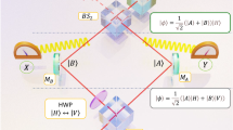 The quantum circuit for the unitary interaction \({\hat{U}}_{{\mathcal{M}}}\) is shown in Fig. 2b and its quantum optical implementation is shown in Fig. 2c. The controlled-Z (CZ) gate imposes a π-phase shift on the vertical polarization of the pointer photon only when the system polarization is vertical. The CZ gate is implemented via two-photon quantum interference at a partial PBS having polarization-dependent transmissions (TH = 1, TV = 1/3) with HWP set at 45∘22,24. The rotating gates are constructed by other HWP. The angles of θa and θg determine the observable \({\hat{{{\Pi }}}}_{a}\) and the measurement strength g = 4θg, respectively. For instance, the observable is given as \(\left|\,\text{V}\,\right\rangle \left\langle \,\text{V}\,\right|\) for θa = 0 and \(\left|\,\text{H}\,\right\rangle \left\langle \,\text{H}\,\right|\) for θa = π/4. Further details on the experimental setup can be found in the “Methods” section.