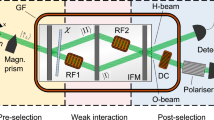 To understand the concept of the experiment, only the devices depicted in the setup of Fig. 1 are necessary. The full experimental setup is described in the following: a beam of monochromatized neutrons with a wavelength λ = 1.9 Å is split by a magnetic prism (not depicted) into two divergent, antiparallelly polarized sub-beams with spin states \(\left|\pm z\right\rangle\). Next, the neutrons enter a static magnetic guide field region (not depicted), generated by a coil in Helmholtz configuration that is placed between polarizer and analyzer and generates a field \({\overrightarrow{B}}_{0}=9\ {\rm{G}}\ {\hat{e}}_{z}\). For later use, we define \(| {\overrightarrow{B}}_{0}| ={B}_{0}\). The purpose of the guide field is to prevent depolarization because of magnetic stray fields, thereby upholding the degree of polarization of P ~ 0.99. Inside the guide field, a direct current spin rotator (DC1, not depicted) is placed in front of the interferometer and produces a local effective magnetic field in x-direction. In this x-field, the polarization vector is rotated due to Larmor precession by \(\pi/2\) from ±z to ±y, parallel to the flight direction of the neutrons. They traverse to a silicon perfect crystal interferometer which is aligned such that only the +y polarized sub-beam fulfills the Bragg condition of the lattice at the first plate of the interferometer. Consequently, the −y polarized sub-beam never reaches the detectors (in practice it is absorbed by a Cd-slab, not depicted).