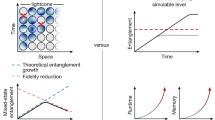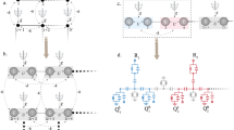 Specifically, the two-qubit system can be directly transferred from the non-entangled state \(\left|eg\right\rangle\) or ∣ge∣ to the maximum entangled states of \(\left(\left|gg\right\rangle \pm i\left|ee\right\rangle \right)/\sqrt{2}\) (Fig. 4a, b), within a time of \({t}_{b}=2\pi /(3\sqrt{3}J)\), under the condition of maximum TRS breaking at ϕ = ± π/2. The density matrices ρ± of the entangled states \(\left|{\psi }_{\pm }\right\rangle\) characterized by quantum state tomography are given in Fig. 4c–f, with fidelities of F+ = 0.963 ± 0.026 and F− = 0.923 ± 0.029. The analytical form of the nontrivial two-qubit unitary operator \({e}^{-iH{t}_{b}}\) is given in the Supplementary Note 3.