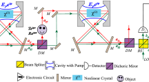 BBO1 and BBO2 are 2 mm BBO crystals pumped by the second harmonic of Spectra Physics Spitfire Ace laser (central wavelength 400 nm, horizontal polarization, average power 65 mW, waist intensity FWHM 240 ± 10 μm). Their squeeze factors G1,2 are found by measuring the mean numbers of photons N1,2 per pulse at their outputs in the regime of vacuum amplification (high-gain parametric down-conversion) and fitting with the parameters B1,2 the obtained dependences on the pump power P with the functions \({N}_{1,2}\propto {\sinh }^{2}{G}_{1,2}\), \({G}_{1,2}={B}_{1,2}\sqrt{P}\). By detuning BBO1 from exact phase matching, G1 is reduced compared to G2. The waist of the coherent beam is inside BBO2 and the waist intensity FWHM is chosen close to the one of the first Schmidt mode44, i.e. 80 ± 10 μm. This ensures mode matching for the coherent beam and, as a result, efficient amplification. Meanwhile, the SV is de-amplified efficiently only in the collinear direction due to its divergence, and spatial filtering at the detection stage is necessary for this purpose.