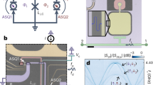 The coupler chain device consists of two capacitively shunted, tunable flux qubits and seven tunable rf-SQUIDs, all equipped with individual readout resonators. Device characterization, circuit parameter extraction, and wiring details are described in Supplementary Note 4. The device is fabricated using the architecture described in ref. 65, and consists of two separate chips - called the qubit layer and the interposer layer. The interposer layer, seated on the device package’s printed circuit board cavity and wirebonded to the exterior control lines, holds the flux bias lines. The qubit layer, hosting the qubits, couplers, resonators, and co-planar waveguide, is indium bump bonded atop. The indium bumps provide structural stability, common ground paths between layers, and a conduit for microwave signals originating on the interposer layer, running through the bumps, and continuing on the qubit layer. This device environment allows greater flexibility than planar devices for distributing flux bias lines, represents a step towards full 3-D integration, and supports an electromagnetic environment suitable for quantum annealing controls.