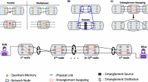 The generation of an entangled link between two end nodes without intermediate repeaters is limited by the distance between the end nodes36—e.g., the noise affecting a photon sent over an optical fiber grows exponentially with the length of the fiber27. Therefore, a repeater chain that makes use of entanglement swapping is needed to generate end-to-end entanglement over long distances.