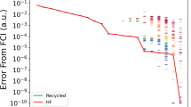 When simulating the smallest molecules (H2 and H4) we apply our noise channel [Eq. (19)] after each application of a CNOT gate. This gate-by-gate method is computationally expensive. To facilitate feasible simulations of molecules larger than H4, we approximate each noisy ansatz element by a corresponding noiseless ansatz evolution and a noise-inducing evolution. The noise-inducing evolution corresponds to depolarizing noise applied to each qubit in accordance with the number of times that qubit was a CNOT target in the ansatz element. We observe that this lower-bounds the effect of noise. For example, for H4, applying noise after each CNOT with gate-error probability \(p={p}^{{\prime} }\), gives approximately the same energy accuracy as applying total noise after each element with \(p\approx 1.3{p}^{{\prime} }\). Consequently, our simulations of larger molecules should not be compared directly with those for H2 and H4. A detailed illustration of our noise approximation is given in Supplementary Note 3.