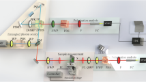 Since \(\left\vert {\Phi }^{-}\right\rangle\) can be obtained from \(\left\vert {\Psi }^{+}\right\rangle\) by a simple polarization rotation, we can always switch from the biphoton state with decoupled DoFs [Eq. (5)] to the one with coupled DoFs [Eq. (6)] and vice versa. The role of the polarization controller (PC) in Fig. 1 is to couple or decouple the two DoFs on demand.