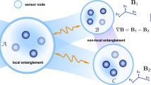 Given a quantum state ρx, where x = (x1, x2, …, xn) are n unknown parameters to be estimated, by performing a POVM, {Mm}, on the state, we can get the measurement result, m, with a probability \({p}_{m}(x)={\rm{Tr}}({\rho }_{x}{M}_{m})\). For any locally unbiased estimator, \(\hat{x}=({\hat{x}}_{1},\cdots \,,{\hat{x}}_{n})\), the Cramér-Rao bound33,34 provides an achievable bound \(Cov(\hat{x})\ge \frac{1}{\nu }{F}_{C}^{-1}\), here \(Cov(\hat{x})\) is the covariance matrix for the estimators with the jk-th entry given by \(Cov{(\hat{x})}_{jk}=E[({\hat{x}}_{j}-{x}_{j})({\hat{x}}_{k}-{x}_{k})],E[\cdot ]\) denotes the expectation, ν is the number of the measurement repeated independently, FC is the Fisher information matrix of a single measurement whose jk-th entry is given by \({({F}_{C})}_{jk}={\sum }_{m}\frac{{\partial }_{{x}_{j}}{p}_{m}(x){\partial }_{{x}_{k}}{p}_{m}(x)}{{p}_{m}(x)}\)34. Regardless of the choice of the measurement, the covariance matrix is always lower bounded by the quantum Cramér-Rao bound as35,36