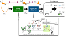 The internal energy of a thermodynamic system is E(ρY; HY): =Tr[ρYHY], and the non-equilibrium free energy35,36 is F(ρY; HY): = E(ρY; HY) − β−1S(Y)ρ, where \(S{(Y)}_{\rho }:=-{\mathrm{Tr}}[{\rho }^{Y}\ln {\rho }^{Y}]\) is the von Neumann entropy23. When a thermodynamic system transforms from t = ti to t = tj as \(({\rho }_{i}^{Y};{H}_{i}^{Y})\mapsto ({\rho }_{j}^{Y};{H}_{j}^{Y})\), we denote the increase in internal energy E, nonequilibrium free energy F, and entropy S as follows: