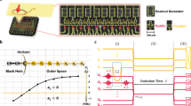 Our treatment of the artificial gravity here is within a quasi-classical approach, which leaves out possible analogues of interesting quantum mechanical effects in curved spacetime. For example, Hawking radiation,49 the radiation of particles from the black-hole horizon stimulated by quantum vacuum fluctuation, may find analogue effects here. Assuming the presence of a black-hole horizon in a topological semimetal setting (as in Fig. 3a), the quantum tunneling process as illustrated in Fig. 6 can be interpreted as the creation of a pair of fermions due to quantum fluctuation: a quasiparticle outside the horizon and a quasihole inside the horizon. The quasiparticle escapes from the horizon, resembling the Hawking radiation. With the metric in Eq. (5) and by direct analogy,23, 49 one can find the associated Hawking temperature \({T_{\rm{H}}} = \frac{\hbar }{{2\pi {k_B}}}{\left| {\frac{d}{{{\rm{d}}z}}\left( {{v_z} - w} \right)} \right|_{{z_h}}}\) for the radiation. Nevertheless, an accurate study of these quantum effects and the methods to probe them is beyond the scope of this work and deserves a future investigation.