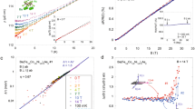 Taken together, direct analysis of the magnetization data for NiCoCr0.8 give the following critical exponents: γ T ≈ 0.5, δ ≈ 3/2, and β T ≈ 1. The subscript T for γ and β indicate the temperature dependence of the relevant variables when the composition x has been tuned to its critical value (x cr ≈ 0.8) where the transition temperature is zero. This is also the notation used in the BKV theory17, 18. These experimental values for γ T , δ, and β T are also the values predicted from BKV theory in the “dirty” or high-disordered limit. In this limit the Widom relationship γ T = β T (δ − 1), is expected to hold18 and within our experimental error it does. This means that only two of the three exponents are independent. In the “dirty” limit, BKV theory18 also predicts that the Curie temperature should increase rapidly as the composition is tuned away from the critical composition as \({T_c} \propto {\left( {{x_c} - x} \right)^{\nu{z_m}}} = {\left( {{x_c} - x} \right)^2}\), since zm = 2 and ν = 1 (from the theory). Although we do not have enough experimental data to show that z m ν is exactly two, a force fit of the T c data to (x c − x)2 does provide a good description of our data as shown in Fig. 3d.