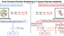 On the microscopic level, two distinct types of vertical scattering have been identified. The first is electron–phonon scattering,1 relevant in elemental metals. At low-temperatures, the Bloch-Grüneisen picture of electron–phonon scattering yields a T5 electric resistivity and a T3 thermal resistivity. The higher exponent for charge transport is due to the variation of the typical wave-vector of the thermally excited phonons with temperature: \(q_{ph} = {\textstyle{{k_BT} \over {\hbar v_s}}}\). Small-angle phonon scattering becomes more frequent with cooling. Therefore, phonons’ capacity to degrade a momentum current declines faster than their ability to impede energy transport. This power law difference leads to L(T)/L0 < 1 in the intermediate temperature window (below the Debye temperature), when phonon scattering dominates over impurity scattering, but all phonons are not thermally excited. A second source of q-selectivity concerns momentum-relaxing electron–electron scattering (See Fig. 2b). The quadratic temperature dependence of resistivity in a Fermi liquid is a manifestation of such scattering.22 This is because the phase space for collision between two fermionic quasi-particles scales with the square of temperature. Since the total momentum before and after collision is conserved, electron–electron collisions degrade the flow of momentum only when the scattering is accompanied by losing part of the total momentum to the lattice. Two known ways for such a momentum transfer are often invoked.23 The first is Baber mechanism, in which electrons exchanging momentum belong to two distinct reservoirs and have different masses. The second is an Umklapp process, where the change in the momentum of the colliding electrons is accompanied by the loss of one reciprocal lattice wave-vector (Fig. 2b). Abundant small-angle electron–electron scattering (which could be either Umklapp or Baber-like) would generate a mismatch in prefactors of the T-square resistivities with the electrical prefactor lower than the thermal one. This is a second route towards L(T)/L0 < 1, prominent in correlated metals.24,25