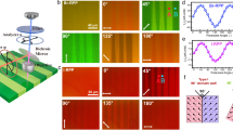 To further confirm that spatial distributions of the color contrast in Fig. 2a, b reflect ferroaxial domain structures, we compared a CID-SHG image and a ferroaxial domain pattern obtained by an EG measurement11,12 (see also Supplementary Note 4). Supplementary Fig. 3a, b show CID-SHG images of another sample by using RCP and LCP fundamental light, respectively. The contrast reversal is also observed in this sample. Comparing the CID-SHG images (Supplementary Fig. 3a, b) with that obtained by the EG measurement (Supplementary Fig. 3c), their domain patterns well match up with each other. This supports that the area with bright and dark colors in CID-SHG images corresponds to different ferroaxial domain (A+ and A−) states. Thus, we confirm that CID-SHG is effective to visualize ferroaxial domain structures. Compared with other experimental techniques such as measurements of rotational anisotropy SHG and EG, the present CID-SHG measurement has the benefit of a large difference in its signals between A+ and A− domains, \(\left[ {I_{{{{\mathrm{RCP}}}}}({{{\mathrm{A}}}} + ) - I_{{{{\mathrm{RCP}}}}}({{{\mathrm{A}}}} - )} \right]/\left\{ {\left[ {I_{{{{\mathrm{RCP}}}}}({{{\mathrm{A}}}} + ) + I_{{{{\mathrm{RCP}}}}}({{{\mathrm{A}}}} - )} \right]/2} \right\}\) = 32 %. This is large enough to easily distinguish A+ and A− domains. In addition, another merit of CID-SHG is the availability to construct three-dimensional images without any destruction of the specimen. Figure 2d shows a three-dimensional image of SH wave distribution under an RCP fundamental light. The magnitude of SH intensity is nearly constant as a function of sample depth, which means the SH activity remains inside the sample and is not ascribed to the surface effect.