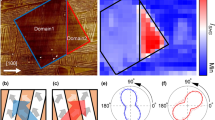 We apply the discussion above, namely, CID-SHG between A+ and A− domains, to the visualization of ferroaxial domain structures in NiTiO3. We measured spatial distributions of SH intensity in single crystals of NiTiO3 by SHG microscopy using circularly polarized fundamental light irradiated along the c axis (see “Methods” and ref. 25). For this measurement, we prepared samples with multi-domain states by a proper annealing procedure (see “Methods” and ref. 12). Figure 2c shows the optical transmission microscope image of the (001) face of a sample. In the image, branch-like patterns are seen and correspond to TiO2 impurities. Except for these impurities, the sample is homogeneous, and it is impossible to distinguish ferroaxial domain states in the microscope image. Figure 2a, b shows the two-dimensional SHG images obtained by RCP and LCP fundamental light with a wavelength of 1200 nm, respectively. These images were collected from the same area as that in Fig. 2c. Bright and dark correspond to high- and low-intensity counts, respectively. The magnitude of the normalized CID-SHG in each area, defined as \(|{{\Delta }}I/I_{{{{\mathrm{AVE}}}}}|\) where \({{\Delta }}I = (I_{{{{\mathrm{RCP}}}}} - I_{{{{\mathrm{LCP}}}}})\) and \(I_{{{{\mathrm{AVE}}}}} = \left( {I_{{{{\mathrm{RCP}}}}} + I_{{{{\mathrm{LCP}}}}}} \right)/2\), is 0.6–1.3, meaning that SHG signals from NiTiO3 strongly depend on circular polarization of incident light. In Supplementary Fig. 2, we show \({{\Delta }}I/I_{{{{\mathrm{AVE}}}}}\) as a function of wavelength of fundamental light in an area where \(I_{{{{\mathrm{RCP}}}}}\) is larger than \(I_{{{{\mathrm{LCP}}}}}\). \({{\Delta }}I/I_{{{{\mathrm{AVE}}}}}\) gradually decreases with increasing the wavelength from 1200 to 1380 nm. This wavelength range corresponds to the Ni2+ d–d transition from the 3A2g ground state to the 3T2g state26,27. The color contrast is reversed from the image of Fig. 2a to Fig. 2b except in the impurity regions. Considering the discussion above, the bright and the dark regions correspond to a pair of ferroaxial domains with the opposite sign of ferroaxial moment. The observed domains are irregular in shape with size on a submillimeter scale.