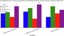 We conducted statistical analyses in three stages. First, we obtained descriptive statistics and sociodemographic and clinical variables of the sample. Second, we performed a Student’s t-test to investigate the associations between people that did JTC and who did not, with three SC subdomains (ER, AS, ToM). The effect sizes of all comparisons were calculated with Cohen’s d using pooled SD. We did not perform multiple comparison corrections due to the exploratory nature of this study73,74. We performed a binary logistic regression analysis with the stepwise method for each of the three tasks of the JTC as the dependent variables, and the subdomains of the SC that were significant in the univariate analysis as independent variables, controlling for positive (PANSS) and depressive (BDI) symptoms and, estimated premorbid IQ (WAIS-III). We controlled for these variables, considering the previous findings about the relationship between positive symptoms and JTC1,17,75, JTC and IQ18,19,43, and SC (almost AS) and depressive symptoms47. All the analyses were performed using the SPSS v24 program46.