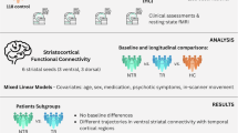 We focused on the connectivity of the mesostriatal interactions that have now become highly implicated in psychosis35. Aberrant striatal connectivity has been well documented and reviewed2. In line with our findings, dopaminergic dysfunction has most frequently been seen in the dorsal (associative) striatum36,37,38. Supporting this, fMRI studies have shown dorsal striatal hypoconnectivity with cortical networks in schizophrenia39,40,41,42,43 and in patients with clinical high risk of psychosis44. Midbrain connectivity is of special interest as dopaminergic activity characterized by increased synthesis and release of dopamine in psychotic disorders originate in the midbrain7,8.