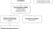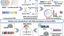 FUMA (https://fuma.ctglab.nl)32 was used to annotate the pleiotropic SNPs. Combined Annotation Dependent Depletion (CADD) score is a widely used tool that predicts the deleteriousness of SNPs for protein structure and function33. Higher CADD scores generally indicate potentially higher disease potential, with a threshold of 12.37. RegulomeDB (RDB) classifies SNPs according to the available evidence of regulatory functions34. Lower RDB scores indicate that SNPs are most likely affecting regulatory elements. The minChrState provides predictions of SNPs’ transcriptional and regulatory effects in different chromatin states35. The predictions range from 1 to 15, and 1 to 7 predictions indicate an open chromatin state. ToppGene (http://toppgene.cchmc.org)36 was used to conduct gene functional annotations for the nearest genes of the pleiotropic SNPs. The FDR Benjamini–Hochberg (FDR-BH) significance level with FDR q < 0.05 was used for multiple comparison correction.