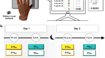 Visualization of performance data was done identically as previously reported2. Performance curve: the within-trials time-resolved representation of tapping speed for illustration of the performance curve in Fig. 1b, f, 2b, 3b, 4b was derived as follows: for each participant, the tapping speed at each of the 10,000 ms constituting one practice period was defined as the average inter-tap interval of the sequence the participant was executing at that moment. The duration of the execution of each sequence was defined as the time between the first keypress of that sequence (or the beginning of the practice period) and the first keypress of the next (or the end of the practice period). The participants’ time series were averaged at each millisecond to give the performance curve.