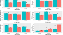 Participants were instructed to tell a story in the target languages based on pictures taken from a children’s wordless story book named “Frog, Where Are You?”85. A microphone recorded the storytelling. No time limit was set for this task. Audio recordings were transcribed by native speakers of the target languages using the CLAN program by following the CHAT transcription manual86. Two transcribers were employed for each language. The first transcriber transcribed the audio recordings, while the second transcriber checked the transcript and coded learners’ errors at the word and sentence levels. The second transcriber also randomly transcribed 10% of the audio recordings from scratch for a reliability test. On average, a 93% consensus was reached by comparing the first-draft transcripts from the first and the second transcribers after removing punctuations. All transcripts were double-checked by research assistants who spoke the target languages as an additional quality control procedure. Discrepancies were noted and resolved by communicating with transcribers. The transcripts were then automatically coded with morphosyntactic information using the CLAN program86. In total, the transcripts contained 70,020 words of French, 65,804 words of German, and 82,904 words of Spanish. The vast majority of these words (93.33%, 96.32%, and 97.18%, respectively) were automatically tagged by the CLAN program.