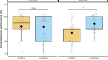 The determination of the individualized signal-to-noise ratio (SNR) might be considered a further limitation. As the individual 50% speech perception threshold in noise was determined using an adaptive matrix sentence test (i.e., the Oldenburg sentence test (OLSA)21) and applied to our naturalistic set of stimuli, a direct transfer of the SNR determined therein was not appropriate (see section Stimulus preprocessing). Since the OLSA uses sentences with no predictability between words that are embedded in speech-shaped noise, a direct transfer of the 50%-threshold determined therein to our stimuli was not possible. Since our stimuli contain contextual information and the participants can draw on their background knowledge due to the proximity to everyday life, embedding them in speech-shaped noise at the SNR determined in the OLSA would have resulted in a significantly higher performance in A-only. In a pilot study we therefore tested noise with different numbers of background talkers and found 48 talkers resulting in performance closest to 50%. However, as piloting was done on a sample of young normal hearing adults (N = 10; MAge = 26.90, SDAge = 3.60, RangeAge = 20–33; PTA < 25 dB HL) we did not consider the higher susceptibility to a variable masker (as it still is the case with 48 background talkers) and the considerable interindividual variability in older adults. As depicted in Fig. 2, performance was widely spread around the mean, which is below 50%. This could also be seen in a previous study that employed a matrix sentence test to determine the speech perception threshold of interest and applied the SNR to another set of stimuli8. It is undeniable that in an experimental setting where A-only and AV conditions are considered, the SNR must be determined individually for A-only to prevent ceiling effects in AV—and even more so when potential improvements in AV are to be measured. When using naturalistic stimuli such as in the present study, it might be preferable to determine the SNR with the same kind of stimuli. Due to the acoustic variability of such stimuli, it is however expectable that significantly more trials are needed to determine a certain performance threshold adaptively. The relevance of equalizing perceptual performance between participants is further underscored by our data with participants improving from pre- to post-training (i.e., learners) having a lower baseline score. As mentioned above (see section Speechreading training improves audiovisual speech perception in noise) baseline and change scores are inherently correlated in clinical trials18. Disregarding baseline imbalances between two study groups may lead to false-positive results where a positive effect is falsely attributed to the treatment.