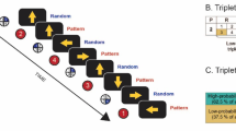 Unknowingly to the participants, the appearance of the stimuli followed a predetermined structure where pattern elements (P) alternated with random elements (R) (e.g. 4-R-2-R-3-R-1-R, where the numbers represent the predetermined position of the stimuli, and “R” represent a random position) (Fig. 1c, d). Due to the pattern elements (P) alternating with random elements (R) in the ASRT task, some triplets (runs of three trials) had a higher probability of occurrence than others (Fig. 1e). For example, in an 4-R-2-R-3-R-1-R sequence, the (4-3-2) or (3-4-1) triplets have a higher probability of occurrence compared to (2-3-2) or (4-3-1) triplets, as the former type of triplets can be found in P-R-P or in R-P-R structures whereas the second type of triplets can only occur in R-P-R structures. As a result, the former type of triplets are five times more likely to occur than the second type of triplets. Thus, the two types of triplets are referred to as high- and low-probability triplets, respectively. Previous studies using the ASRT task have consistently shown that, with increasing practice in the task, participants’ responses to the last element of high-probability triplets become faster compared to responses to the last element of low-probability triplets18,93,94. Importantly, this phenomenon occurs without the emergence of an explicit knowledge of the sequence structure as reported by the participants18,21,94. Thus, implicit SL in the task can be measured by computing the difference of reaction times between the last elements of high-probability triplets and the last element of low-probability triplets.