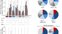 The RMs were sedated with ketamine-HCl (10 mg/kg) for intradermal- and intramuscular vaccination and blood collection through venipuncture. For aerosol vaccine administration, bronchoalveolar lavage (BAL) and intrabronchial Mtb inoculation animals were sedated with ketamine-HCl (5 mg/kg) and medetomidine (0.04 mg/kg). RMs were sedated with ketamine-HCl (5 mg/kg) and medetomidine (0.04 mg/kg) after which positron emission tomography–computed tomography (PET–CT) procedures were performed under full isoflurane anesthesia. The Mtb inoculum was delivered to a segmental bronchus in the left caudal lung lobe using a bronchoscope. The RMs were challenged with 11–19 colony forming units (CFU) per inoculum with a targeted average dose of 15 CFU per inoculum in a volume of 3 ml of physiological saline solution. Due to the size of the cohort and logistical limitations, this study was executed in a stacked manner with animals divided into four stacks that were treated similarly at 1-week intervals. By stratification, each stack contained animals from each treatment group (see Supplementary Table 1). Cells from the pulmonary mucosa were recovered at specific time points by bronchoalveolar lavage (BAL), targeting the lower left lung lobe. Three volumes of 20 ml of prewarmed 0.9% saline solution were consecutively instilled and recovered. BAL fluid was harvested by centrifugation of BAL samples for 10 min at 400g after 100 μm filtration. Supernatant was subsequently decanted and stored at −80 °C pending further analysis. The BAL cell pellet was resuspended in Roswell Park Memorial Institute medium supplemented with 10% fetal calf serum (FCS), glutaMAX, and penicillin/streptomycin (from now on referred to as R10) and used in downstream assays freshly.