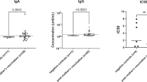 Descriptive statistics were calculated using GraphPad Prism 9.0.1 (GraphPad Software) and Stata 13.0 (StataCorp LP). Continuous variables are presented as median with interquartile range (IQR), categorical variables as numbers and proportion. To ascertain differences in antibody concentration between different specimens at specific timepoints, t-test was applied. To ascertain longitudinal differences in antibody concentration, repeated-measures ANOVA was applied. In case of missing values, we analyzed the data by fitting a mixed that uses a compound symmetry covariance matrix and is fit using Restricted Maximum Likelihood. In the absence of missing values, this method gives the same P values and multiple comparisons tests as repeated measures ANOVA. In the presence of missing values (missing completely at random), the results can be interpreted like repeated measures ANOVA. Pearson’s r coefficient was used to assess the correlation between antibody concentrations. Reporting of results follows the Strengthening the Reporting of Observational Studies in Epidemiology reporting guidelines35.