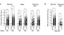 We also analyzed body weight and survival of K18-hACE2/B-KO mice immunized with pCTV-WS and challenged with Wuhan strain or the Omicron variant. All mice died up to 9 DPI, confirming the importance of nAbs in protecting against the ancestral strain (Fig. 8v–w). On the other hand, K18-hACE2/B-KO mice immunized with pCTV-WS and challenged with Omicron variant showed reduction in viral RNA load (p < 0.01), similar to the vaccinated K18-hACE2 mice (Fig. 8x). All together, these results demonstrate that protective immunity against Wuhan strain (B lineage) and Delta variant is primarily mediated by nAbs, whereas protection in immunized mice against Gamma seems to be mediated by both nAbs and T cells. Importantly, protective immunity to Omicron variant is predominantly mediated by T cells.