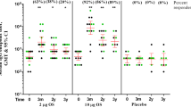 We found that 1790GAHB-induced low levels of S. sonnei LPS-specific fecal sIgA that increased only slightly after the second vaccination, with similar levels observed in the placebo group. Fecal OAg-specific IgA levels have been previously correlated with protection against shigellosis in the case of infection14 or post-immunization with live oral Shigella vaccines37,38, likely as a result of induced mucosal immunity. Thus, at 7 days post-infection with lyophilized S. sonnei 53G in a different CHIM trial in adults, LPS-specific fecal IgA responses were higher in volunteers not progressing to shigellosis than those developing shigellosis after challenge. Moreover, fecal IgA responses continued to increase throughout 14 days post-infection only in volunteers not progressing to shigellosis14. To our knowledge, there is no other assessment of fecal sIgA responses reported after immunization with parenteral Shigella vaccines, as parenteral vaccines are known to induce systemic, rather than mucosal immune responses8. As expected, the magnitude of the fecal sIgA response in our study was lower than that reported after the administration of two live oral S. sonnei vaccine candidates, WRSs2 and WRSs337. In addition to the parenteral administration of the vaccine, other factors could contribute to the low fecal sIgA responses observed after vaccination with 1790GAHB. For instance, antigen-specific fecal sIgA levels were shown to peak between 10 and 14 days and decrease at 28 days post-vaccination with the live oral WRSs2 and WRSs3 vaccines37, therefore the timing of the assessment in our study may not have been optimal to detect an increase in IgA response.