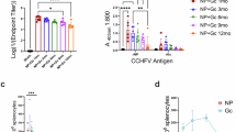 To prepare constructs expressing the CCHFV-NP, we utilized the established recombinant VSV platform expressing either the full-length Ebola virus glycoprotein (VSV-EBOV)29,30,31 or the recombinant VSV-EBOVΔGCΔMLD31 that harbors deletions of the glycan cap (GC) and mucin-like domain (MLD) which carry important immunodominant regions of the EBOV-GP32,33,34 to prepare constructs expressing the CCHFV-NP. The latter approach was chosen to skew immune responses toward the CCHFV-NP. The gene coding the full-length open reading frame of the CCHFV-NP from strain Hoti was ligated into either the VSV-EBOV (VSV-CCHFnp1) or the recombinant VSV-EBOVΔGCΔMLD plasmid (VSV-CCHFnp2) (Fig. 1a). Sequencing confirmed that no mutations were observed in VSV-CCHFnp1 and VSV-CCHFnp2. Additionally, we prepared the VSV-CCHFgpc vaccine candidate by replacing the gene encoding the VSV glycoprotein with the CCHFV strain Hoti GPC gene (Fig. 1a). The CCHFV-GPC gene used possesses a deletion of 53 amino acids off the carboxy terminal region of the Gc previously shown to promote rescue of VSV-CCHFgpc but retaining the Gc transmembrane domain35, designated CCHFV-GPC_del53. The VSV-CCHFgpc vaccine candidate grew poorly and was therefore passaged four times in Vero E6 cells to enhance viral titers. Deep sequencing of the passaged VSV-CCHFgpc revealed one synonymous mutation at nucleotide position 1122 (S374S) and two non-synonymous mutations (R520K & N759T) in the open reading frame of the CCHFV-GPC (Supplementary Fig. 1a). In vitro expression of CCHFV-NP, CCHFV-GPC, EBOV-GP, and VSV-M was confirmed by immunofluorescence assay (Fig. 1b) and western blot (Supplementary Figs. 1b, c, 2) on Vero E6 cells infected with the different recombinant VSV vaccine candidates.