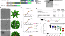 We evaluated the fusion ferritin particles by negative-stain electron microscopy (NS-EM) to establish if display of the antigens resulted in the correct nanoparticle architecture. Raw images and 2D class images revealed that pure and homogenous nanoparticles are formed with protruding visible densities around ferritin particle (Fig. 1e) consistent with the use of flexible linkers between the antigens and the ferritin nanoparticle.