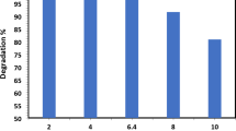 The pH of the solution is an important factor in the non-homogeneous catalytic degradation of organic pollutants, which affects the PMS activation, the catalyst surface charge, and the types of free radicals in the system23. To elucidate the effect of initial pH on dye degradation, the pH of the initial dye solution was adjusted to 3, 7, and 10. Subsequently, 1.0 g/L of Co@MXene and 3 g/L of PMS were added to the dye solution and treated at 25 oC for 0–36 min. The resulting dye degradation is depicted in Fig. 3c. When the initial pH was set at 3 or 7, dye degradation percentage increased gradually over time, little difference in trends in degradation rates. However, when the pH was raised to 10, dye degradation exhibited three distinct stages: 0–8 min, 8–26 min, and beyond 26 min. In the initial phase, dye degradation percentage surged rapidly, reaching 89.48%, which is 36.28% higher than the degradation percentage observed at pH 3 within the same timeframe. This phase can be characterized as the rapid growth period. When the treatment time exceeded 8 min and continued to extend, the dye degradation percentage incrementally increased to 97.85%, reflecting an 8.37% rise. Beyond 26 min of treatment, the dye degradation percentage plateaued, entering a stable equilibrium phase. The degradation rates corresponding to pH values of 3, 7, and 10 were 0.1068, 0.0894, and 0.1172 min−1, respectively. These results indicate that dye degradation was fastest under alkaline conditions, slowest under neutral conditions, and intermediate under acidic conditions. This can be attributed to the alkaline reaction conditions potentially enhancing the decomposition of PMS by Co@MXene to produce singlet oxygen (1O2)24. Although the initial pH influences the dye degradation rate, the final degradation percentage levels exceeded 97.1% in all cases, demonstrating the efficacy and wide applicability of the catalytic system.