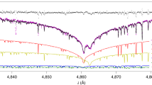 A continuous observing window of 4.5 h was obtained through directors discretionary time on the 8.2 m VLT with the UVES. Each exposure lasted for 730 s with a readout time between exposures of 45 s, totalling 20 exposures. We employed an observing set-up of the dichroic 1 mode with central wavelengths of 3,900 Å and 5,640 Å for the blue and red arms, giving a wavelength range that covered the full visible spectrum apart from gaps of 80 Å at 4,580 Å and 5,640 Å. A slit width of 1.0” and a 2 × 2 binning granted a spectral resolution R = 20,000 and the wavelength calibration accuracy was approximately 200 m s−1 (refs. 54,55).