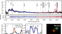 Alternatively, we modelled the spectrum of J1007_AGN in line-free windows with two continuum models. First, we modelled the continuum emission with a combination of an attenuated power-law model f(f2500, αλ, Av) and a scattered-light power law g(f2500, αλ, fsc). Both power laws were defined by the same intrinsic flux at 2,500 Å, f2500, and the same slope, αλ. The former model was then attenuated by AV using a standard attenuation curve73, and the latter was multiplied by a scattered-light fraction fsc. With these models, we performed a Markov chain Monte Carlo likelihood fit using emcee66. We introduced a Gaussian prior on the power-law slope with a mean of −1.5 and a standard deviation of σ = 0.3, because a uniform prior fit always preferred extremely steep (αλ < −3), physically unmotivated, power-law slopes. All other parameters received uniform priors. Our results indicate that the underlying continuum emission originated from a steep power law (\({\alpha }_{\lambda }={-1.98}_{-0.27}^{+0.23}\) and \({f}_{\text{2500}}={21.61}_{-6.58}^{+9.44}\)) that has been attenuated (\({A}_\mathrm{V}={2.79}_{-0.25}^{+0.25}\,{\rm{mag}}\)). We found the scattered-light fraction \(\log_{10}(\;{f}_\mathrm{sc})={-1.74}_{-0.21}^{+0.19}\). Figure 2 displays the median model along with the 68th-percentile posterior range in orange. The model can reasonably well approximate the continuum emission within the flux uncertainties. However, the rest-frame ≲3,000 Å region seems slightly underpredicted, whereas the rest-frame ~3,000–4,000 Å region is slightly overpredicted by this fit.