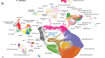 For the analysis of (1) epithelial, (2) endothelial and (3) immune cells, we selected the corresponding clusters of the 163,000 cell dataset and harmonized the cells according to the donor parameter, using the ‘PrepSCTIntegration’ function in Seurat with default settings and 5,000 features (genes) and regressing out stress-related genes (‘AddModuleScore’ function in Seurat)81,82, that have been previously shown to get induced by enzymatic tissue dissociation at 37 °C (ref. 83). Because of the large size of mesenchymal cell subset (>138,000 cells), we used donor 17 as a reference dataset for the harmonization of the different donor datasets. Especially for the analysis of the neuronal cells, we selected the donor datasets with more than 29 cells, that facilitated their decent integration (5 PCW: 49 cells, 5.5 PCW: 187 cells, 6 PCW: 169 cells, 7 PCW: 227 cells, 8 PCW: 38 cells, 8.5 PCW: 52 cells and 14 PCW: 30 cells). The selected 752 cells were further processed as all other categories.